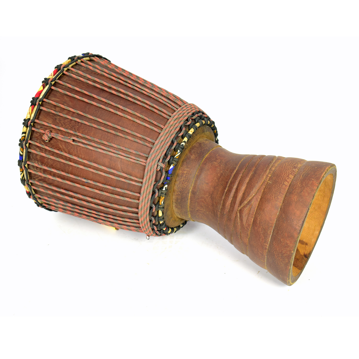 De djembe is zorgvuldig afgewerkt en de poot heeft eenvoudig houtsnijwerk.