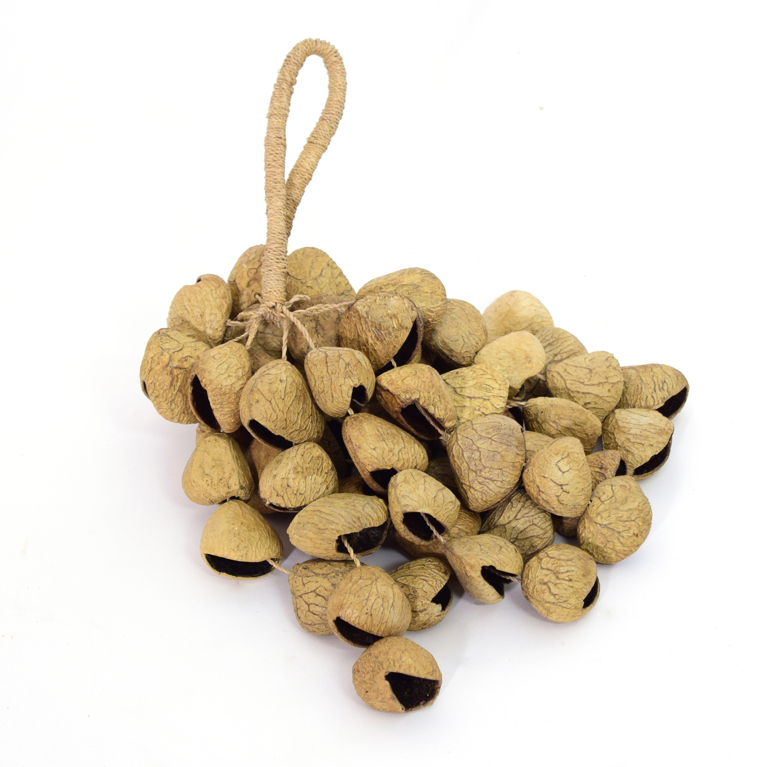 Deze grote tros gedroogde vruchten geeft een klaterend en rammelend geluid. Mooi om een sfeer van oerwoud of een suggestie van een waterval op te roepen. Je houdt de tros vast aan het ronde raffia handvat.