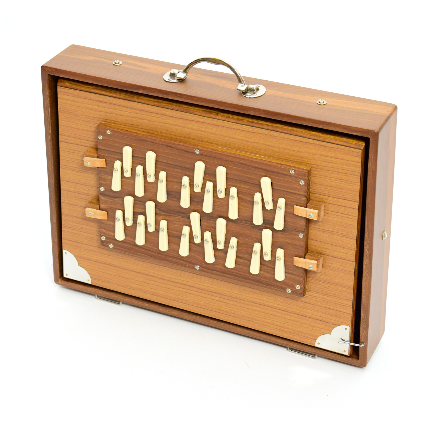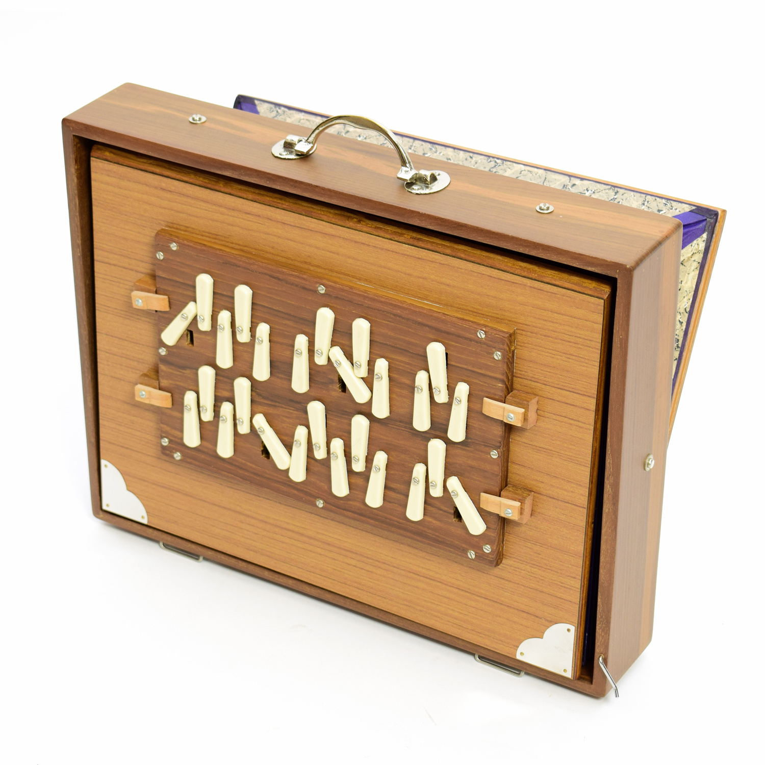 Onderaan vind je de hele tonen ofwel witte toetsen, boven vind je de halve tonen ofwel zwarte toetsen. Dit specifieke instrument heeft twee rijen tonen, respectievelijk de twee octaven beginnend en eindigend op 'G'. Hiermee kun je extra brede klanklandschappen creëren.