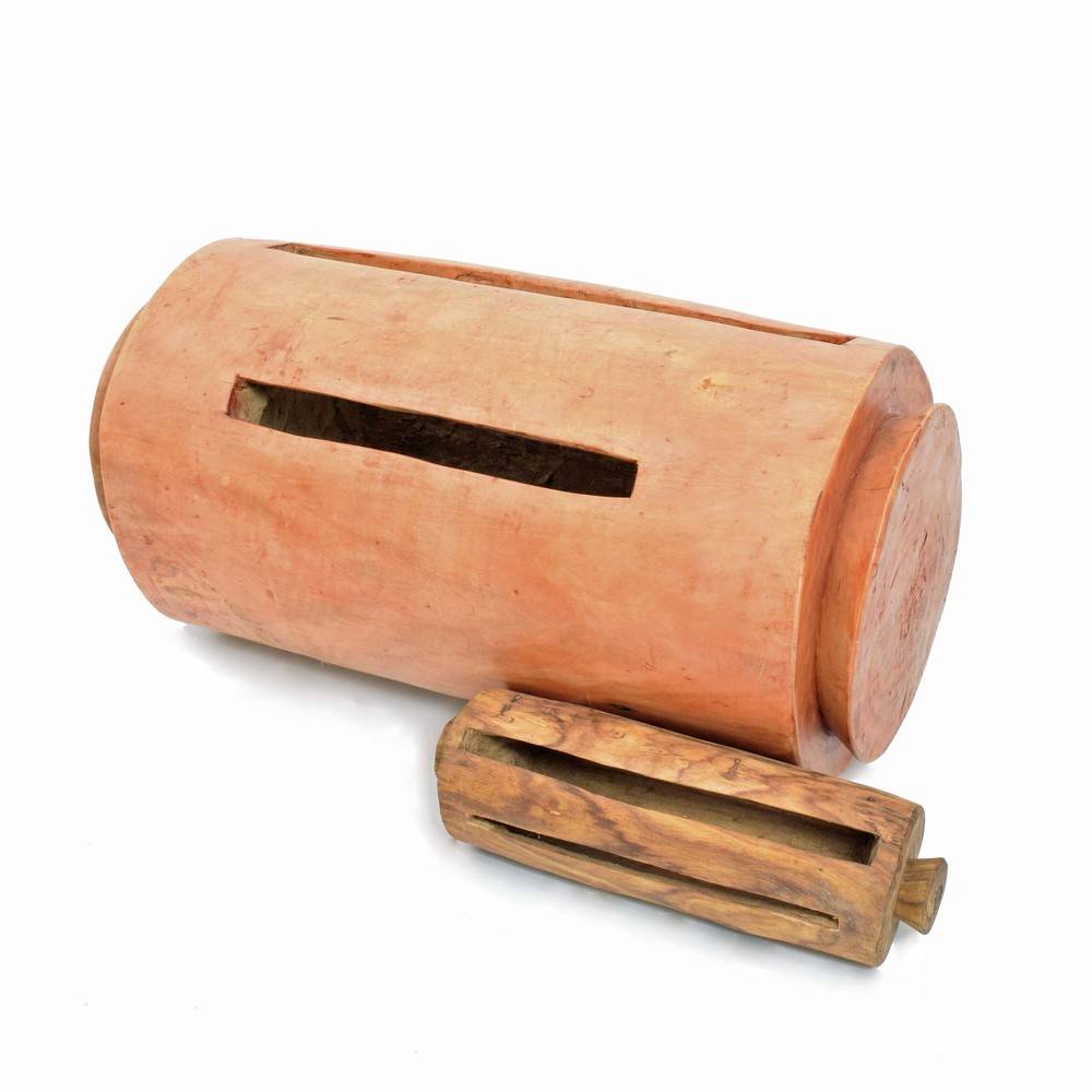 Een reusachtige logdrum uit Guinee. Er ligt een gewone krin naast om aan te geven hoe groot deze krin is.
