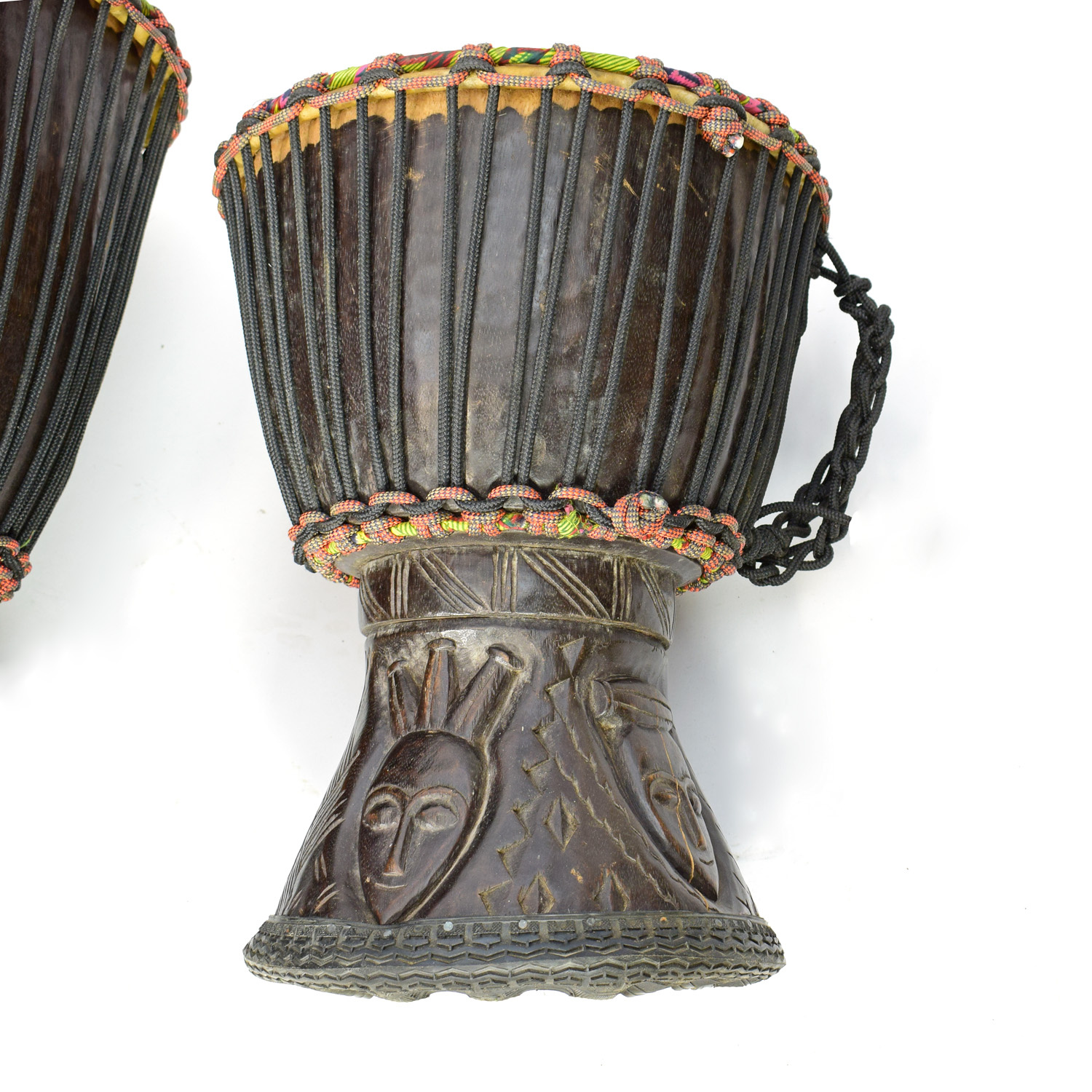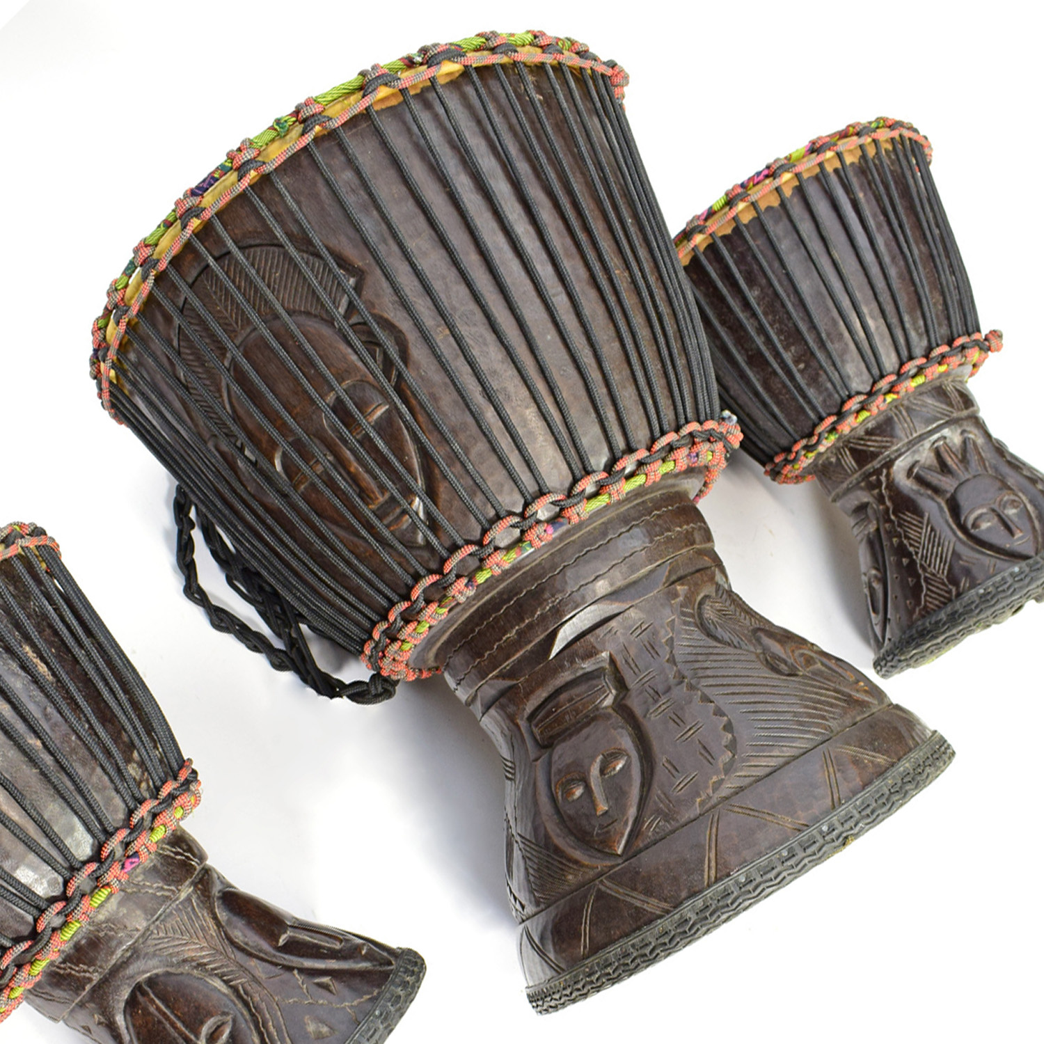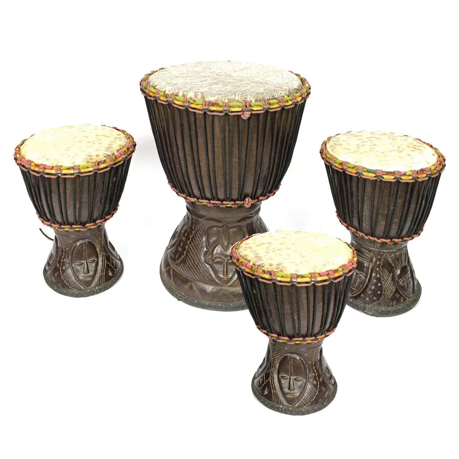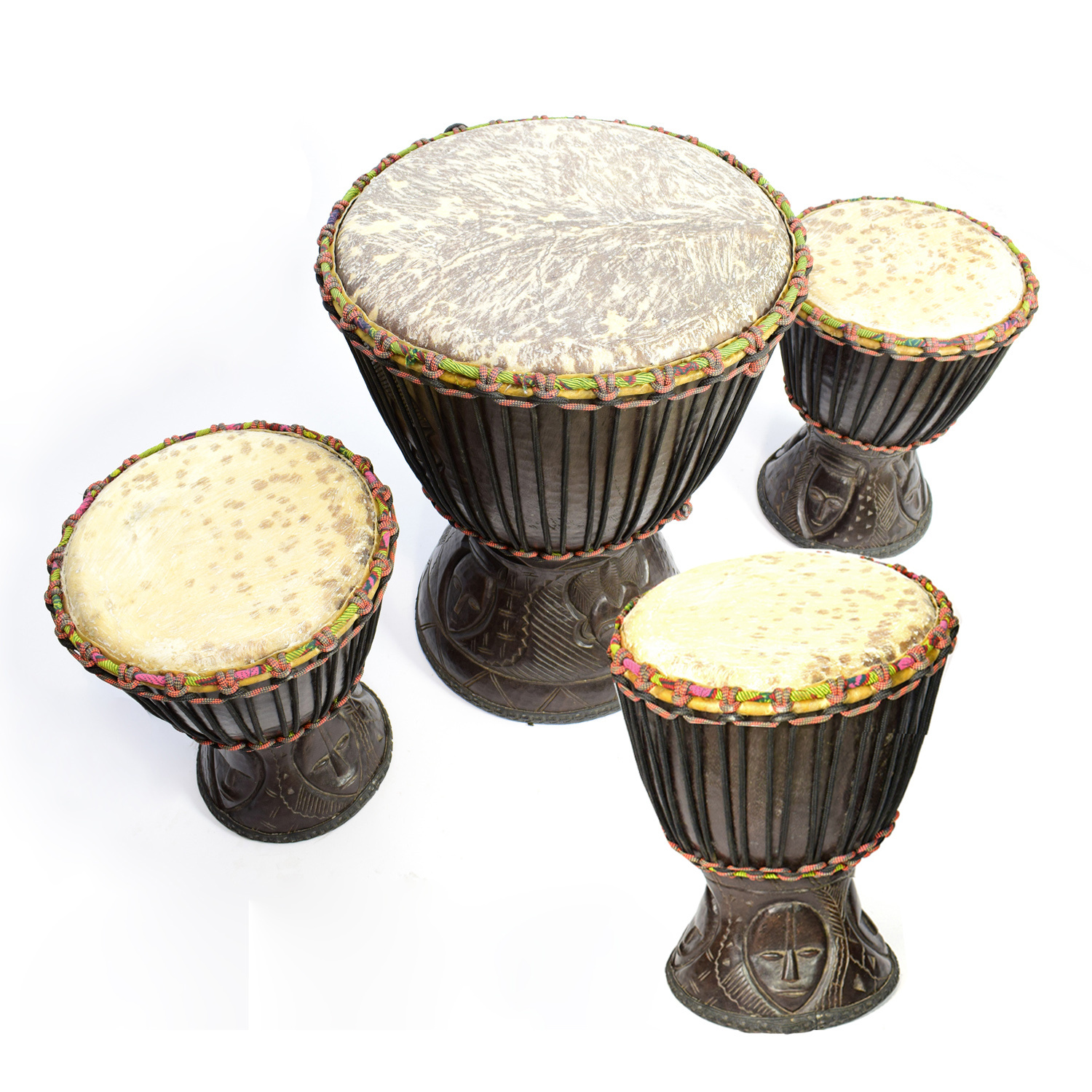 Met deze set van 1 grote plus 3 kleine massief houten djembés creëer je een unieke zithoek. De grootste djembé is de tafel, terwijl de drie kleinere djembés als passende krukjes/stoelen gebruikt kunnen worden.